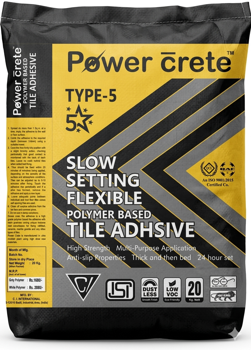 -Highly polymer modified and flexible adhesivesfor installation of large format/ slim tiles on most of the substrates to accommodate movements. These offer exceptional handling properties with good sag and slump resistance installation on floors and walls respectively.t can applied up to 18 mm bed thickness.